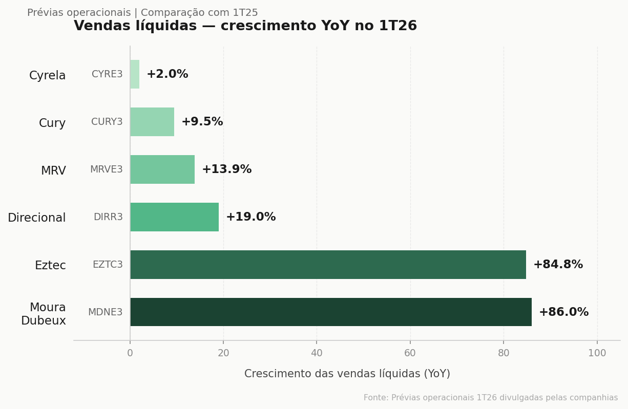 📊 Vendas líquidas no 1T26 —crescimento anual por incorporadora
